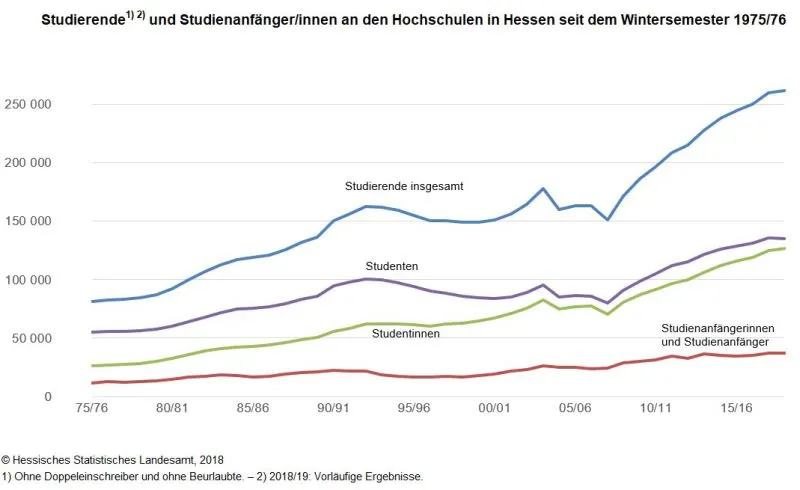 Männer und Frauen. Die Universität in Kassel meldete 25 300 und die Universität in Marburg 24 000 Studierende. Die beiden Universitäten in privater
