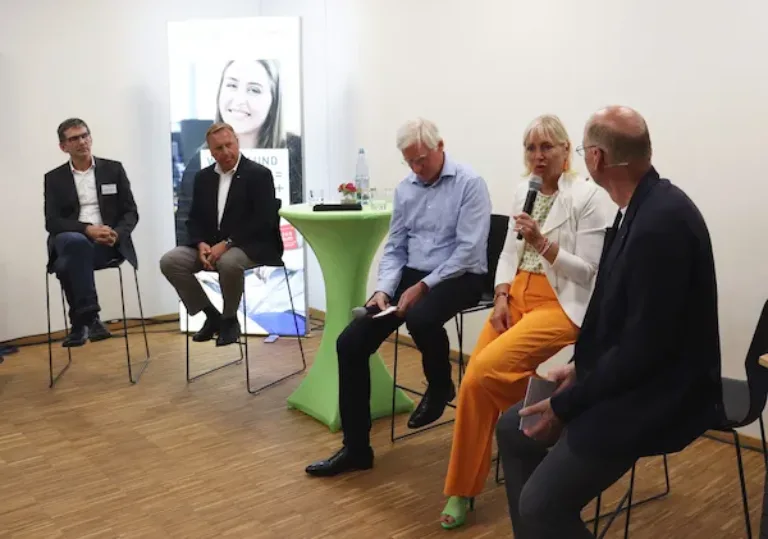 In der anschließenden Talkrunde tauschen sich Klaus Bernhard, Geschäftsführer der Breitband GmbH, Dietmar Persch Hauptgeschäftsführer der IHK Lahn-Dill und Holger Leinweber, Schulleiter der Beruflichen Schulen Biedenkopf mit der Digitalministerin aus. Bernhard, der für den Glasfaserausbau in der Region verantwortlich ist, berichtete über die langjährigen Bemühungen in diesem Bereich. Bereits 2013 habe man mit einem Budget von 8,4 Millionen Euro begonnen, den bedarfsgerechten Ausbau voranzutreiben. Ein Meilenstein sei die Anbindung aller Schulen an das Glasfasernetz im Jahr 2020 gewesen. Das langfristige Ziel bestehe darin, Glasfaser in alle Gebäude der Region zu bringen.