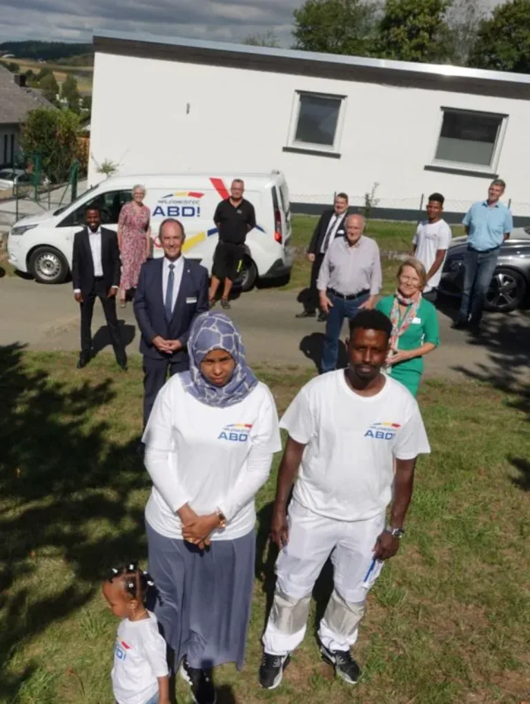 Als kleines Treffen geplant, wird der Kreis der Teilnehmer letztlich immer größer mit Menschen, die diese Leistung ebenfalls würdigen wollen oder die den jungen Mann auf dem Weg begleitet haben. Denn eines wird auch bei der Corona-gerechten Runde klar – ganz standesgemäß am Rande einer seiner Baustellen: So ganz alleine ist eine solche Biografie kaum zu schaffen. So stehen nun fast ein Dutzend im Kreis vor einem Bungalow in einem Bischoffener Ortsteil, wo er als „Malermeister Abdi“ gerade Renovierungsarbeiten erledigt. „Das hier ist eine Erfolgsgeschichte, die ich mit dieser Begegnung bekannter machen möchte, denn wir müssen viel mehr auf die gelungenen Integrationsbiografien schauen“, sagt der Regierungspräsident in seiner Begrüßung.