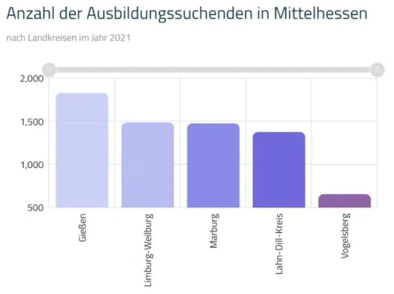 In der Region Mittelhessen wurden seit Oktober 2020 6836 Ausbildungssuchende registriert und beraten. Das waren 671 junge Menschen weniger im Vergleich zum Vorjahreszeitraum. In der Gesamten Region Mittelhessen beläuft sich der Auszubildendenrückgang auf 8,94%