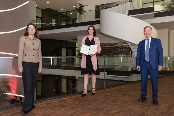 Gemeinsame Freude über die besondere Auszeichnung bei Dr. Christiane Pleuger (Mitte) sowie den Vorstandsmitgliedern Stiftungsvizepräsidentin Prof. Dr. Gabriele Krombach und Stiftungspräsident Friedrich Bohl. (Quelle: Christian Stein)
