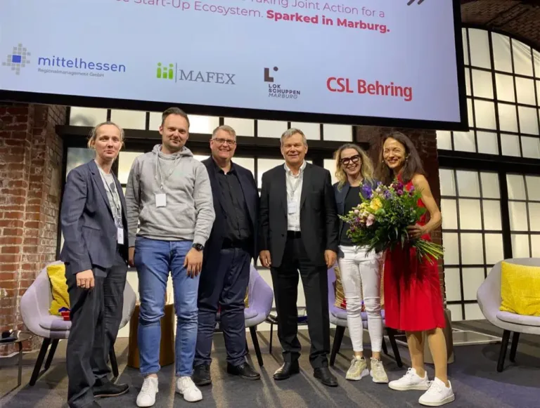 Den Abschluss des Abends bildete ein interaktives Panel auf dem Prof. Vivien Procher, Maria Pennanen, Dr. Serghei Glinca, Dr. Thomas Spies und Jens Ihle platz nahmen. Während Serghei Glinca messbaren Kennzahlen eine hohe Relevanz bescheinigte, um die Entwicklung eines Ökosystems wirklich abbildbar zu machen, sah Maria Pennanen den Schlüssel eher in hohen Freiheitsgraden und bezahlbarer Arbeitsflächen für Startups und Gründer. Einigkeit herrschte bei der Frage nach Sichtbarkeit. So sei insbesondere auch wichtig über die Erfolge und Innovationen von Cooperates in der Region zu berichten, schließlich sei ein „Startup“ ja erst der Start auf dem Weg zum Big Player, betonte Oberbürgermeister Thomas Spies. Jens Ihle ergänzte, dass der Nährboden eines Ökosystems Vertrauen zwischen den einzelnen Playern sei. Ohne ein gutes Vertrauensverhältnis zwischen old- und new economy wären gewinnbringende Kooperationen nicht möglich.