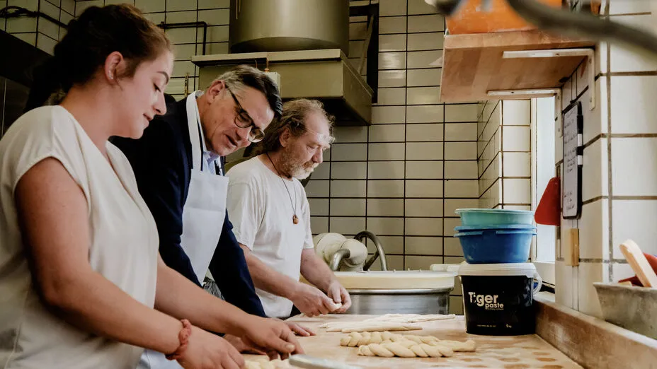In der Bäckerei Stoll traf Rhein auf echtes Handwerk. Zwischen duftenden Brötchen und frischem Brot sprach er mit den Bäckerinnen und Bäckern über Nachwuchsprobleme, hohe Kosten und überflüssige Vorschriften.