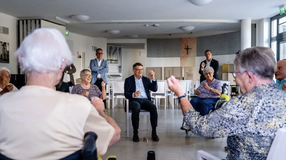 Im Haus Elisabeth wurde es ruhig und sehr persönlich. Rhein sprach mit Pflegerinnen, Senioren und freiwilligen Helfern. Es ging um Ausbildung, Betreuung und um die Frage, wie Menschen in schweren Zeiten gut begleitet werden können.
