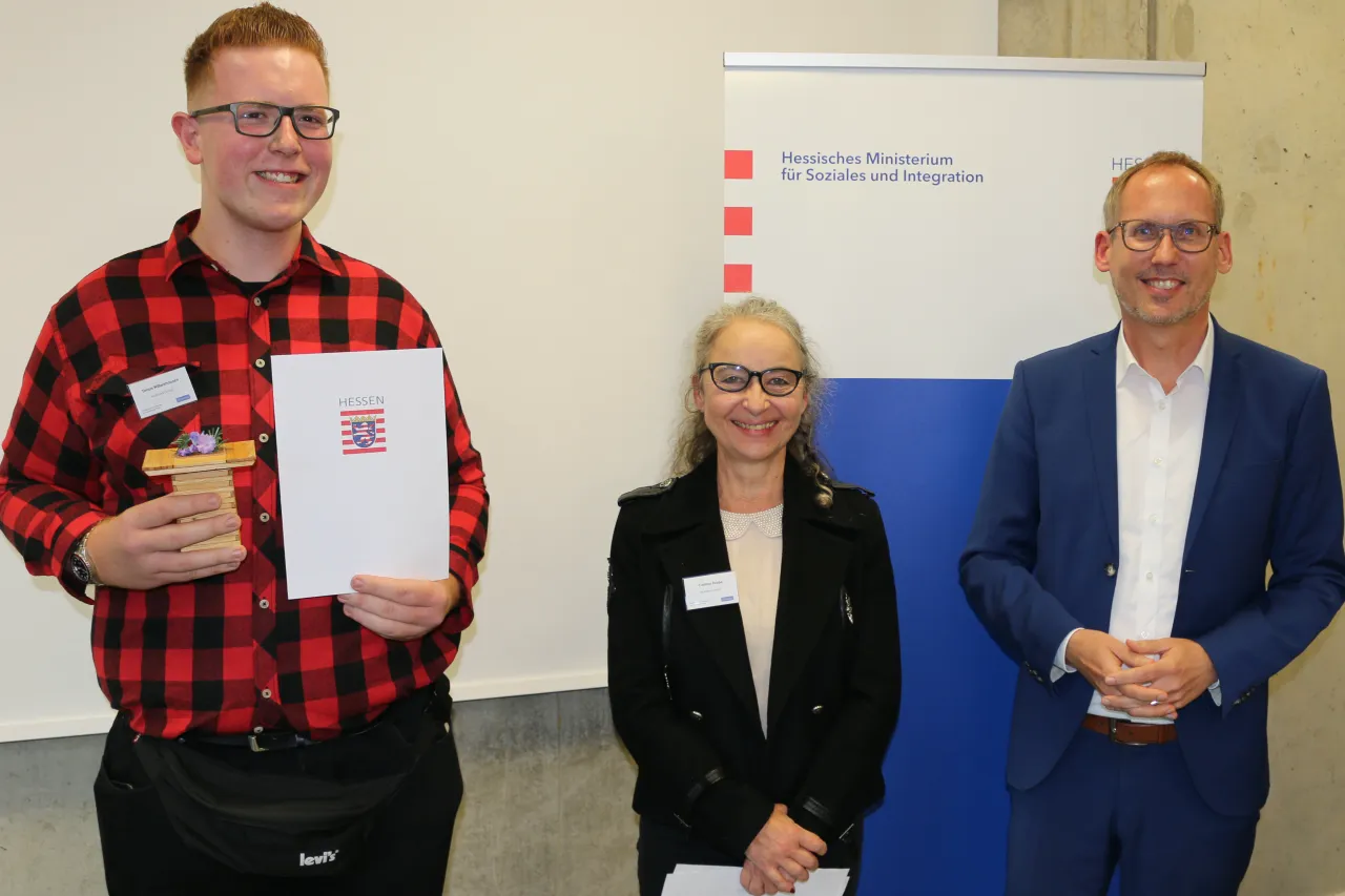 Preisübergabe an das Unternehmen adunox GmbH – Schotten: Said El-Hagge, Dominique Schwarz, Staatsminister Kai Klose (v.l.n.r., Foto: © BWMK (Behindertenwerk Main Kinzig))Der nächste ausgezeichnete Betrieb, die adunox GmbH aus Schotten, ist in der Befestigungsmittelbranche tätig und kooperiert seit seiner Gründung 2010 mit den Werkstätten der Schottener Sozialen Dienste. „Sie gehen ganz selbstverständlich auf die Bedürfnisse ihrer Beschäftigten ein – egal, ob das behinderungsbedingte Fehlzeiten sind, die Verlängerung notwendiger Pausen oder die Gestaltung von Aufgabengebieten – und ermöglichen Ihren Mitarbeitenden so Teilhabe am Arbeitsplatz und bieten echten Team Spirit“, sagte der Minister über das Unternehmen aus dem Vogelsbergkreis.