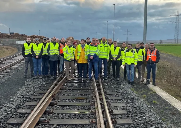 Rund 25 Teilnehmerinnen und Teilnehmer folgten der Einladung in den Vogelsbergkreis. Sie erhielten bei einer Werksführung neben Informationen zur Unternehmensgruppe einen umfangreichen Einblick in die Erfahrungen rund um die Errichtung des Gleisanschlussneubaus, den laufenden Güterverkehr am Standort, die perspektivischen Entwicklungsziele sowie die betrieblichen Prozesse. Dabei standen Fragen zur Ausgestaltung und den Kosten des Gleisanschlusses sowie zum Planungsprozess im Vordergrund. Aber auch Aspekte wie die Transporte im Vor- und Nachlauf und die Erfahrung mit verfügbaren Streckenkapazitäten waren Teil des Austauschs. Fragen zu den Kosten von Schienen- und Straßentransporten, insbesondere im Kontext der aktuellen Gesetzesbeschlüsse der Bundesregierung zur Lkw-Maut, wurden ebenso thematisiert.