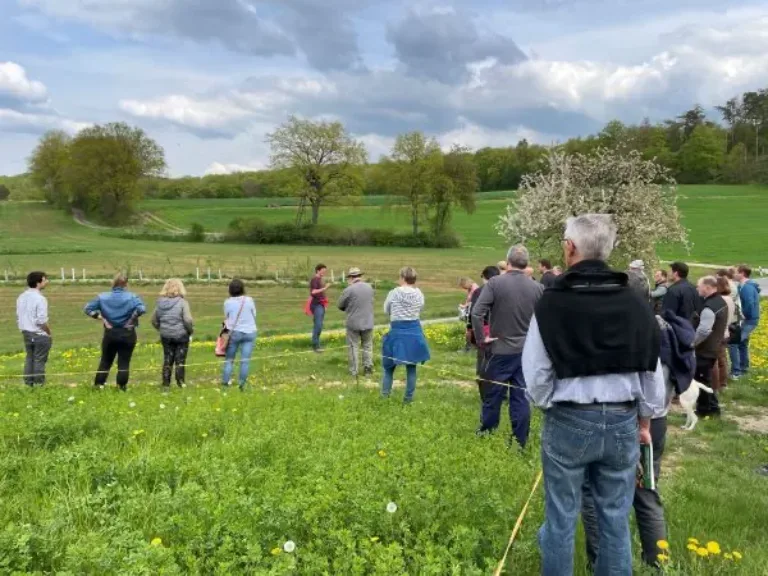 Da dieses Agroforstsystem insbesondere der Forschung dient, erläuterte Dr. Weckenbrock wichtige Messungen zur Bodenuntersuchung, dem Wasserhaushalt und der Ertragserhebung, die durch den Biomassezuwachs der Bäume erwartet wird. Neben dem Erosionsschutz wird von weiteren Ökosystemdienstleistungen ausgegangen. Dazu zählen die Erhöhung der Artenvielfalt, der Klimaschutz durch Kohlenstoffspeicherung und eine erhöhte Flächenproduktivität. Zum Schluss besuchte die Gruppe das silvopastorale Agroforstsystem, das Nutzbäume und Grünland kombiniert. Diese Fläche wird nach Fertigstellung des neuen Forschungsstalls als Weidefläche für die Milchviehherde genutzt. Die Bäume in diesem System werden in einigen Jahren eine wichtige Rolle als Schattenspender einnehmen. Zusätzliche Hecken dienen dem Windschutz und fördern die Artenvielfalt. Die Ökomodell-Region freut sich über das große Interesse und den regen Austausch aller Teilnehmerinnen und Teilnehmer.