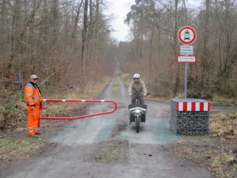 Waldwirschaftswege sind oft mit Schranken versehen. Zum einen soll verhindert werden, dass Kfz-Verkehr durch den Wald abkürzt. „Sind die Schranken offen, gibt es bei großen Veranstaltungen im ehemaligen Kloster Schiffenberg, aber auch zum Kletterwald Schiffenberg immer wieder unerwünschten Schleichverkehr.“, weiß Stadtförster Ernst-Ludwig Kriep zu berichten. „Außerdem soll illegaler Abtransport von gelagertem Stammholz erschwert werden. Die Forstwege müssen aber auch jederzeit für Rettungsfahrzeuge befahrbar sein. Radverkehr dagegen ist laut Hessischem Waldgesetz in der Regel zugelassen.“ Kriep hat selbst die Erfahrung gemacht, wie schwierig es für Radler sein kann, in den Wald zu kommen. Er nutzt seit etwa einem Jahr für Dienstfahrten oft das Lastenrad. Deshalb hat er zusammen mit dem städtischen Tiefbauamt und der Radverkehrsbeauftragen eine andere Lösung ausgetüftelt.