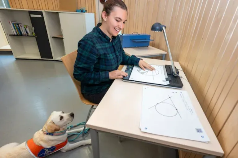 Der neue Arbeitsplatz eröffnet blinden und sehbehinderten Studierenden einen selbstständigen Zugang zu ihren Lernmaterialien. Er ist mit taktilen Zeichenbrettern, einem tactonom reader und einem Schwellkopierer ausgestattet. Die Studierenden können damit digital aufbereitete Grafiken auf beschichtetem Spezialpapier ausdrucken. Die bedruckten Flächen auf diesem Papier werden dann im so genannten Schwellkopierer erhitzt und so zu tastbaren Elementen. Es entsteht eine taktile Grafik, die die Studierenden mit dem tactonom reader erkunden können. Den tastenden Fingerbewegungen folgend, ruft der Reader akustische Informationen ab, die in einer Datenbank hinterlegt sind. Zusätzlich können auf den Zeichenbrettern auch eigene Skizzen zur Verdeutlichung angefertigt werden.