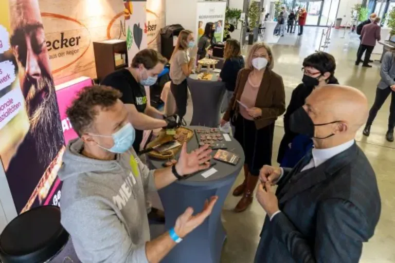 In den Messehallen 4 und 5 sowie im verbindenden Foyer zeigten rund 60 Aussteller ihr Angebot: Teils an Einzel-, teils an Gemeinschaftsständen präsentierten sich beratende und fördernde Institutionen und Dienstleister sowie spannende Gründungen mit ihren Produkten. Das Spektrum der beratenden Institutionen reichte dabei von Banken, Hochschulen und heimischen Wirtschaftsförderungen über die Industrie- und Handelskammern, die Handwerkskammer Wiesbaden und die Kreishandwerkerschaft bis hin zu Coworking-Spaces, Betriebsberatern und Rechtsanwaltskanzleien. Die Gründungsszene selbst präsentierte sich entsprechend vielseitig und lud zu Gesprächen, zum Austausch und zum (Aus)probieren ein. Wurst, die nicht aus Fleisch, sondern aus Wels besteht, konnte man bei der Angelburger Metzgerei Marée am Gemeinschaftsstand der Wirtschaftsförderungen der Stadt Marburg und des Landkreises Marburg-Biedenkopf probieren. Vom daneben liegenden Stand der Wirtschaftsförderungen der Stadt Alsfeld und des Vogelsbergkreises schwirrten kleine, per Tablet ferngesteuerte Roboter aus, die auch mal in der benachbarten Halle vorbeischauten, um dort Messebesuchern freundlich „Hallo“ zu sagen. Egal, ob Tierfutter aus Seidenraupen, Naturkosmetik aus Bienenprodukten oder eine neue Verhütungsmethode für den Mann – die Gründer und Gründerinnen präsentierten pfiffige und innovative Ideen aus der jeweiligen Branche. Traditionelle Wurstwaren wie Ahle Woscht oder Stracke kann man sich über die MeatApp direkt vom handwerklichen Metzger nach Hause bestellen – „in der Stadt bei der hohen Dichte an Supermarktketten kaum noch möglich“, erklärt Julian Bonn, während er die sehr gefragte Probierhäppchen ausgibt. Und gleich nebendran konnte man sich Nachtisch abholen – Jakob Rauber von der Lahnauer „Eiszeit“ präsentierte hier sein aktuelles Weihnachtssortiment. Ebenfalls sehr gefragt war der geschmackvoll gestaltete Stand der „Weinschicht“.