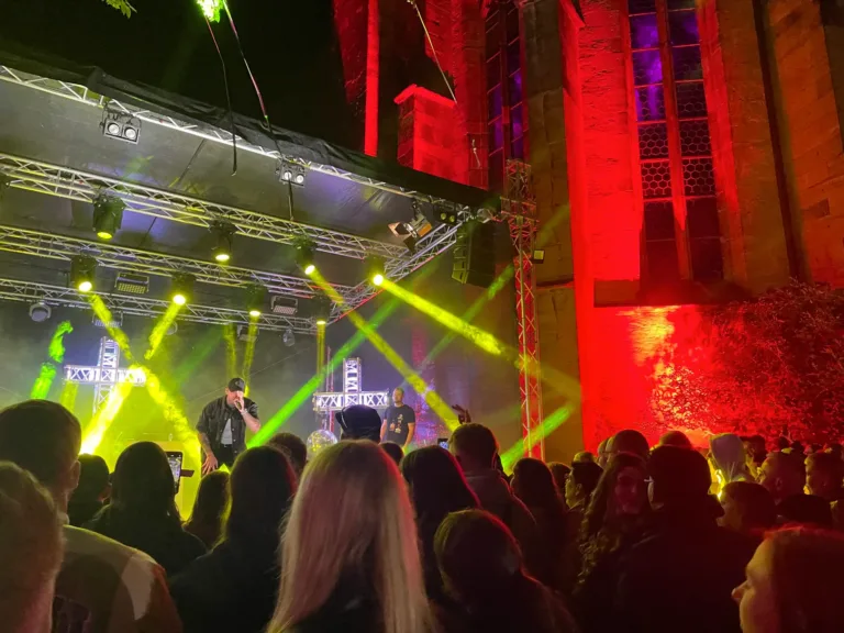 Bevor es am Sonntag zum Jubiläumsfrühschoppen mit den Original Antrifttaler Musikanten im Klostergarten kam, fand dort am Abend zuvor das Highlight – insbesondere für jüngeres Publikum auch zum Teil von weit hergereist – des Wochenendes statt: das Heimspiel des Alsfelder Deutschrappers Ced, der mit seiner 7.7 Musiker Crew sowie der heimischen Sängerin Maila die Menge begeisterte.
