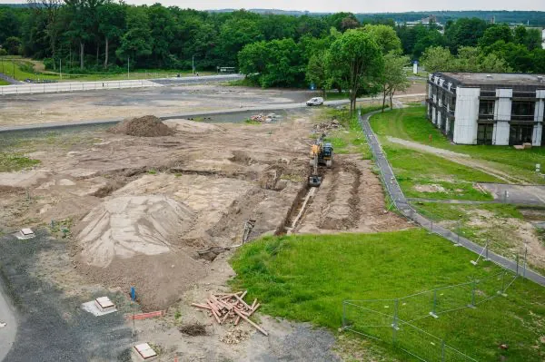 Es wird wieder gebaggert: Mit dem Neubau der Zentralbibliothek und des Universitätsarchivs entsteht im Philosophikum der Justus-Liebig-Universität Gießen (JLU) das erste Gebäude, das direkt am neuen Campusplatz liegen wird. Der viergeschossige Bau, der mit der bestehenden Universitätsbibliothek verbunden wird, ist das größte Gebäude des mit dem Land Hessen abgestimmten Masterplans zum Umbau des Philosophikums und wird – gemeinsam mit dem Seminargebäude I und der neuen Mensa – den zentralen Platz an der Rathenaustraße prägen. Im Erdgeschoss wird es eine Cafeteria des Studentenwerks mit Außenbereich geben. Der Entwurf stammt von dem renommierten Berliner Architekturbüro Max Dudler.