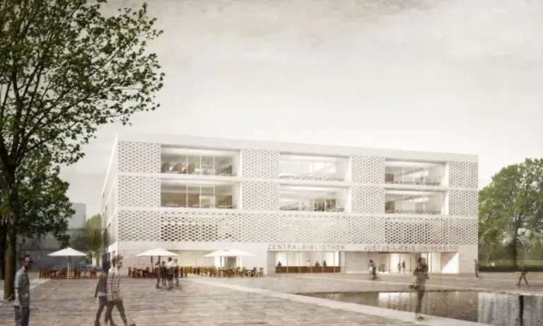 Die Zentralbibliothek wird am künftigen Campusplatz im Philosophikum entstehen. (Rechts im Bild: Der Bestandsbau der Universitätsbibliothek.) (Quelle: JLU/Katrina Friese)Bei der Konzeption der Zentralbibliothek, die insgesamt rund 53 Millionen Euro aus dem Hochschulbauprogramm HEUREKA des Landes Hessen kosten wird, wurde besonderer Wert auf die Integration von studentischen Arbeitsplätzen und ein zukunftsorientiertes Konzept als Wissensspeicher und Lernort gelegt. Insgesamt werden rund 17.450 Regalmeter Buchstellfläche, 41 Arbeitsplätze für Beschäftigte und 618 Plätze für Nutzerinnen und Nutzer in Einzel- und Gruppenarbeitsräumen und einem Learning Center zu Verfügung stehen. Ein Forschungslesesaal schließt an ein neues und hochmodernes Sondermagazin für die besonders wertvollen Bestände wie etwa die Papyrussammlung oder die mittelalterlichen Handschriften der Universitätsbibliothek an. Auch die älteren Bestände des Universitätsarchivs finden hier Platz, während im Erdgeschoss für die Akten ab 1945 etwa 580 Regalmeter Magazinfläche zur Verfügung stehen. Der Neubau wird zusätzlich eine Nebenstelle des Hochschulrechenzentrums enthalten. Die Baumaßnahme wird vom Landesbetrieb Bau und Immobilien Hessen durchgeführt.