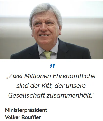 Hessen gibt es zwei Millionen Ehrenamtliche, sie sind der Kitt, der unsere Gesellschaft zusammenhält“, sagte der Hessische Ministerpräsident Volker Bouffier beim ersten der drei regionalen Ehrenamtstage, bei dem die Landesregierung das Ehrenamt