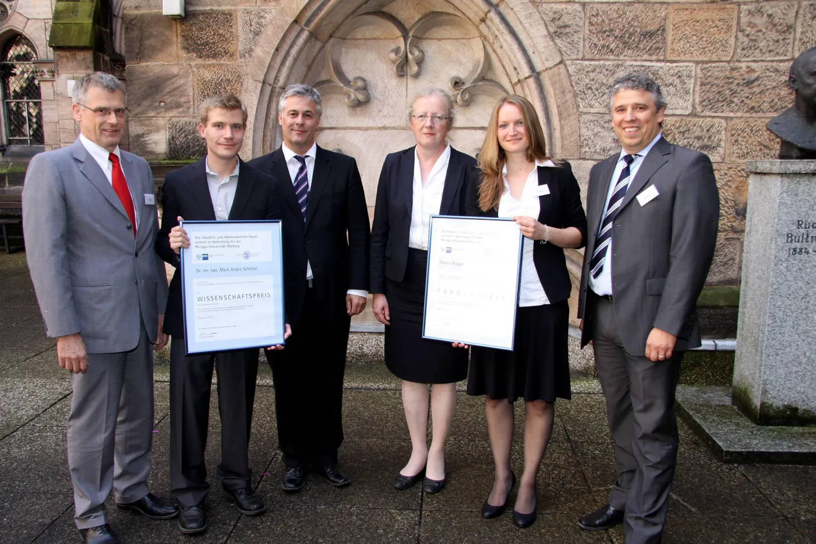Den Wissenschaftspreis für das Jahr 2011 hat die Industrie- und Handelskammer (IHK) Kassel an zwei Absolventen der Philipps-Universität Marburg verliehen. Die Jury zeichnete die Doktorarbeit „Erzeugung und Nachweis von Terahertz-Strahlung unter Verwendung von Multimode-Lasersystemen“ von Dr. rer. nat. Dipl.-Ing. Maik Andre Scheller mit dem Wissenschaftspreis aus. Damit verbunden ist ein Preisgeld in Höhe von 5.200 Euro. Zudem überzeugte Manon Krüger mit ihrer Masterarbeit „Über Adeno-assoziierte Viren vermittelte zentrale Überexpression der Protein Tyrosin Phosphatase 1b und der Glykogen Synthase Kinase 3ß im Hypotalamus von C57BL/6-Mäusen“. Der Förderpreis ist mit 1600 Euro dotiert.