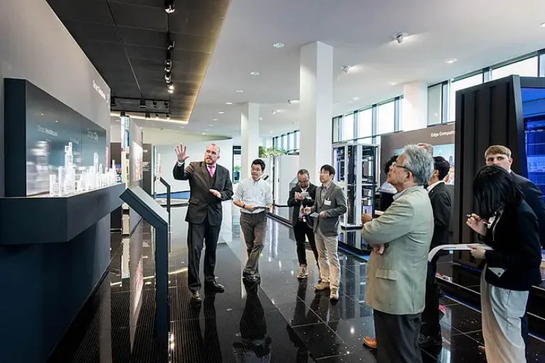 Die Japaner informieren sich im smart factory lab der Technischen Hochschule Mittelhessen (THM). (Foto: THM)