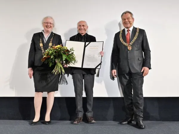 Oberbürgermeister Dr. Thomas Spies und Universitätspräsidentin Prof. Dr. Katharina Krause überreichten Philippe Rousselot den 20. Marburger Kamerapreis. (Foto: Georg Kronenberg)