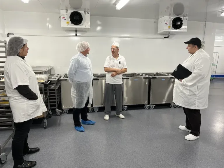 Zum Schluss geht es in die Umkleidekabinen. Hier schaut die Lebensmittelüberwachung, ob die Mitarbeitenden einen geeigneten Ort zum Umziehen und Verstauen der Straßenkleidung haben. Das Urteil der Fachleute am Ende der Begehung fällt positiv aus: Es sind keine schwerwiegenden Mängel festzustellen. Den Eindruck teilt auch Dezernent Zuckermann: „Die Stimmung im Betrieb ist entspannt. Es gibt eine gute Organisation der Abläufe und der Standard der Einrichtung ist hoch“, beschreibt er die Küche.