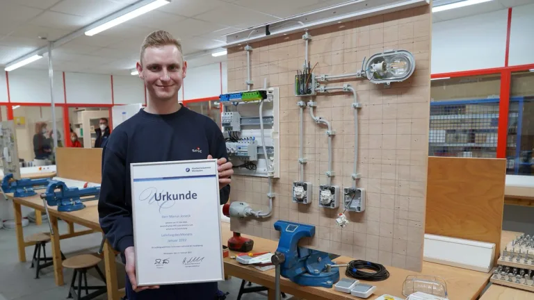 Ausbilder Jens Lechner lobt Marius Joneck, er zeige deutlich überdurchschnittliche Leistungen, arbeite sehr konzentriert und habe ein hohes Verantwortungsgefühl, das im Umgang mit Strom sehr wichtig sei. Auf Baustellen, bei Kunden und Kollegen sei Joneck sehr beliebt und als zuverlässiger Mitarbeiter gefragt. Ein Schwerpunkt seines Arbeitsbereiches seien Elektroneuinstallationen im Krankenhausbereich und Elektroarbeiten beim Umbau von Krankenstationen. Seine Berufsschulnoten sind gut bis sehr gut. Die Firma SPIE Lück GmbH wird Marius Joneck als Gesellen nach der Ausbildung übernehmen. Jonecks Bestreben ist es, sich nach Abschluss der Lehre weiter fortzubilden. Die Meisterprüfung hat er im Fokus. In seiner Freizeit ist er bei der freiwilligen Feuerwehr aktiv und läuft gerne.