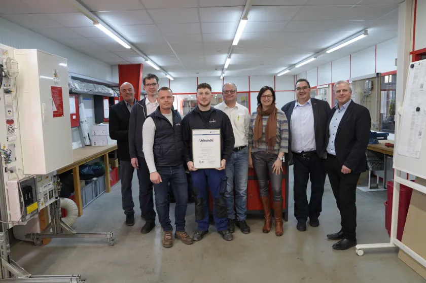 Leo Damion Rullmann (4.v.li.) wurde von der Handwerkskammer Wiesbaden durch den stv. Hauptgeschäftsführer Dr. Christoph Gelking (2.v.re.) zum Lehrling des Monats Januar ausgezeichnet. Weitere Glückwünsche überbrachten Uwe Bock, stv. Hauptgeschäftsführer der Kreishandwerkerschaft Gießen (li.) und Carsten Müller, stv. Obermeister der Innung für Elektro- und Informationstechnik Gießen (2.v.li.) sowie Mitarbeiter der SPIE Lück GmbH. (Bildquelle: Handwerkskammer Wiesbaden)