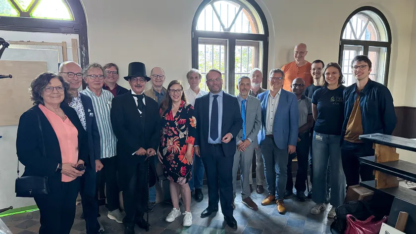 Freuen sich mit Minister Gremmels über die Auszeichnung „Museum des Monats“: Vorstandsmitglieder der Justus-Liebig-Gesellschaft zu Gießen e. V. (JLGG) rund um den 1. Vorsitzenden Prof. Dr. Gerd Hamscher (8.v.r.) und Experimentatoren des Liebig-Museums mit Dr. Stephan Becker als „Liebig” (5.v.l.) – gemeinsam mit dem JungesChemieForum Gießen rund um seine stellvertretende Sprecherin Silke Müsse (2.v.r.) sowie Oberbürgermeister Frank-Tilo Becher (8 v.l.), Nina Heidt-Sommer, MdL (5 v.l.) © HMWK