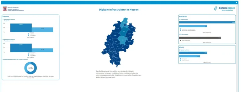 „Wir haben Ziele mit unserer Gigabitstrategie und beim Mobilfunkpakt, an denen wir uns messen lassen. Mit dem neuen Dashboard wird der aktuelle Umsetzungsstand bei der digitalen Infrastruktur in Hessen für jede und jeden nachvollziehbar. Damit leistet das Dashboard einen wichtigen Beitrag zu noch größerer Transparenz“, ergänzte Sinemus. Entsprechend der Gigabitstrategie für Hessen liefert das so genannte Dashboard verschiedene Versorgungs- und Ausbauzahlen zu den drei zentralen Bereichen Festnetz, Mobilfunk und WLAN. So veranschaulicht das neue Tool beispielsweise, die weit über 1.000 aktiven 5G-Standorte in Hessen, die fast 1.300 öffentlichen Hotspots sowie den besonderen Umstand, dass bereits 96,5% der hessischen Haushalte mit einer Geschwindigkeit von mindestens 50 Mbit/s versorgt werden. Hessen befindet sich damit auf Platz 2 unter allen Flächenländern.