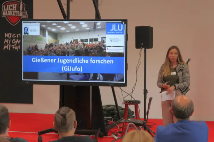 Hildegard Fröbe vom Institut für Biologiedidaktik der Justus-Liebig-Universität Gießen stellte das Projekt „Gießener Jugendliche forschen“ vor. Die Initiative ist 2015 aus dem Impuls „Stadt der jungen Forscher 2010“ hervorgegangen und wird gemeinsam mit der Hermann-Hoffmann-Akademie umgesetzt. Sie bietet naturwissenschaftlich interessierten Schüler:innen ab der Jahrgangsstufe 5 die Möglichkeit, eigene Forschungsideen aus dem MINT-Bereich in kleinen Teams zu entwickeln und umzusetzen. Betreut werden die Jugendlichen von Studierenden, die ihrerseits im Rahmen eines Seminars zu Mentor:innen ausgebildet werden. Unterstützt werden die Gruppen zudem von Wissenschaftler:innen der JLU, die als „Science Coaches“ wertvolles Feedback geben. Der Projektzeitraum erstreckt sich jeweils von den Osterferien bis in den Spätherbst. Höhepunkt ist die Präsentation der Ergebnisse beim Wissenschaftsfestival in der Hermann-Hoffmann-Akademie und im Institut für Biologiedidaktik. Aktuell läuft bereits der elfte Durchgang. Ein Beleg dafür, dass das Konzept nicht nur nachhaltig wirkt, sondern auch kontinuierlich Nachwuchs für Forschung und Wissenschaft begeistert.