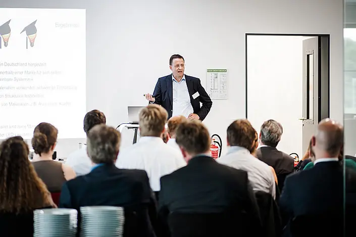 In diesem Zusammenhang beschrieb Dr. Lars Matysiak, Hochschulassistent an Bauschs Professur für Strategisches und Internationales Management, in seinem Vortrag den Stand der Forschung zu „erfolgreichen Internationalisierungsstrategien“. Mit Zahlen und Grafiken definierte der Jungforscher, wann die Erweiterung der eigenen Geschäfte über den Heimatmarkt hinaus erfolgreich sein kann – und wann nicht. Kern seiner Forschung sei dabei zu erkennen, welche Bedingungen für den Erfolg innerhalb und außerhalb der Heimatregion gelten und welche Unterschiede sich dabei ergeben. Dabei spielten Begriffe wie „Kosten der Fremdheit“ und „Über-Internationalisierung“ durch einen zu komplexen Koordinationsaufwand eine Rolle.
