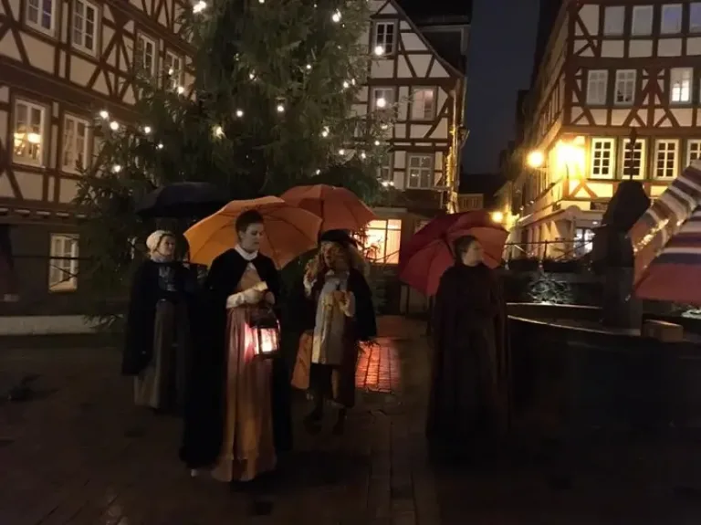 Unter dem Titel „Weihnachtliche Stadt(Ver)Führung – „O du Goethliche“ konnten die Teilnehmer und Teilnehmerinnen die Spuren Goethes in Wetzlar sowie die Sehenswürdigkeiten der Altstadt kennenlernen. In einem kurzweiligen Theaterstück in der Stadtkulisse zeigten die Darsteller eine Weihnachtsgeschichte aus dem Jahre 1773.