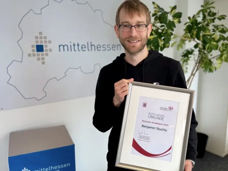 Auch 2025 tritt Ökosystemmanager Benjamin Stuchly stellvertretend für das Regionalmanagement Mittelhessen als Botschafter des Preises für die Region Mittelhessen auf. „Wir unterstützen den hessischen Gründerpreis gerne, weil wir der festen Überzeugung sind, dass die wirtschaftliche Weiterentwicklung des Standorts Hessen nur durch unternehmerischen Nachwuchs, egal ob in der Neugründung, oder als Nachfolge, sichergestellt werden kann.“, so Stuchly. Stellvertretend für Schirmherr Kaweh Mansoori überreichte Referatsleiterin Carolin Friedländer aus dem Hessischen Ministerium für Wirtschaft, Energie, Verkehr, Wohnen und ländlichen Raum die diesjährigen Botschafterurkunden.