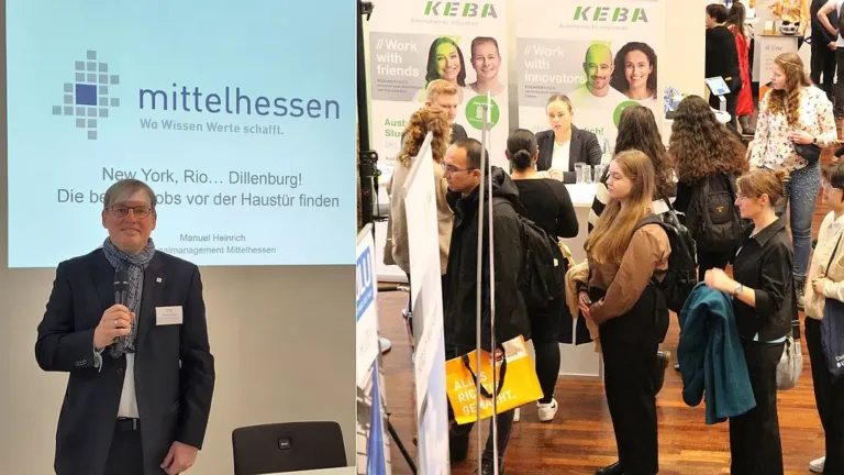 Die einleitenden Grußworte sprachen die Vizepräsidentin der THM, Prof. Dr. Katja Specht und die Vizepräsidentin für Studium und Lehre der JLU, Prof. Dr. Katharina Lorenz. „Nutzen Sie die Gelegenheit, ins Gespräch zu kommen und Kontakte zu knüpfen“, ermunterte Specht die Gäste. Mit rund 40 Ausstellern bot „Karriere weltweit“ ein breites Spektrum an Arbeitgebern von MLP über DB, Continental, Bundeswehr, Agentur für Arbeit bis hin zu Ärzte ohne Grenzen. Die Veranstaltung brachte Unternehmen – von lokal bis global –, Studierende und Alumni zusammen und stellte internationale Berufsperspektiven sowie Praktika, Jobs und Stipendien im Ausland in den Mittelpunkt. „Von Gießen aus in die ganze Welt, das ist eine ganz besondere Chance, sich weiterzuentwickeln“, so Lorenz. Potenzielle Arbeitgeber wie das Auswärtige Amt konnten kennengelernt und sich über Berufsfelder bei der EU informiert werden. Über ein Online-Karriereportal konnten bereits im Vorfeld Gespräche mit interessanten Unternehmen vereinbart werden. Außerdem gab es Informationen zu Auslandsaufenthalten während und nach dem Studium.