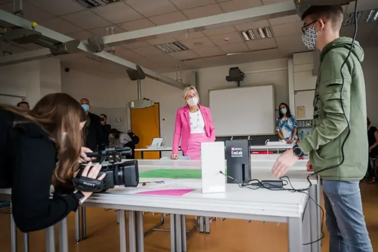 Gruppenbild mit Ministerin Prof. Dr. Kristina Sinemus sowie Verantwortlichen und Schülern des EXOLab-Projekts in Zeiten des Social Distancing. (Foto: Regionalmanagement Mittelhessen, Tilman Lochmüller)