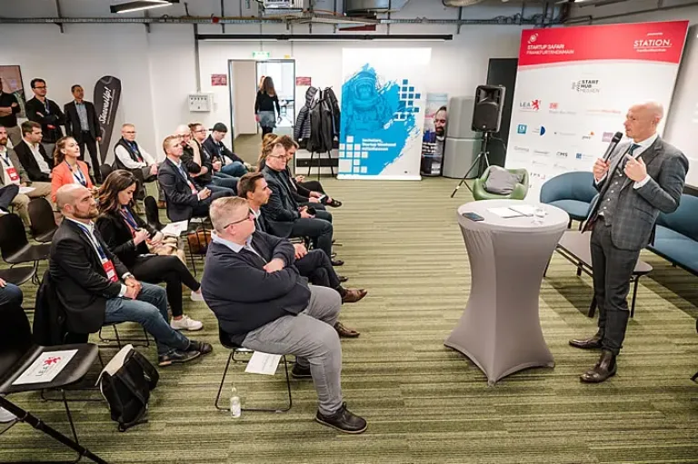 Carolin Wagner und Fabian Annich vom Veranstalter Station Frankfurt, einer regionalen Anlaufstelle für Startups und Innovatoren, freuten sich bei dieser fünften Auflage des Formats über einen Rekord von über 800 Teilnehmerinnen und Teilnehmern, die nicht nur live mit Hilfe von Shuttle-Bussen an den verschiedenen Event-Orten dabei waren, sondern auch online per Live-Stream. „Wir sind die größte dezentrale Veranstaltung für Startups und Innovatoren in Hessen und Frankfurt Rheinmain“, sagte Wagner.