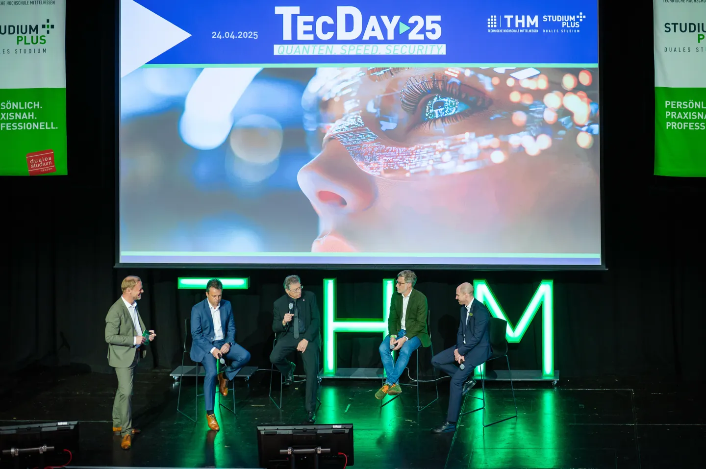 Der TecDay ist für StudiumPlus ein wichtiger Termin im Jahreskalender. Das zeigte sich auch im Grußwort von Dr. Walter Fischedick vom Hessischen Ministerium für Digitalisierung. Darin wies er unter anderem auf die große Bedeutung der Förderung von Digitalisierungsprojekten auch im Bereich der Quantencomputer hin. Prof. Dr. Jochen Frey, Vizepräsident der THM, unterstrich dies und stellte am Beispiel einiger Projekte vor, wie die THM hilft, Zukunftstechnologien in die Region zu bringen und zu fördern. Dabei betonte er, dass es wichtig sei, dass Hochschulen, Unternehmen und StartUps zusammenarbeiteten. In ihrer anschließenden Keynote stellte Sarah Lewandowski, die unter anderem die B ayer AG in KI-Fragen berät, Erfolgsstrategien für die Zukunft vor, diskutierte, welche Bedeutung klassische Software zukünftig habe und erläuterte, wie KI helfen könne, kommende Herausforderungen zu meistern.