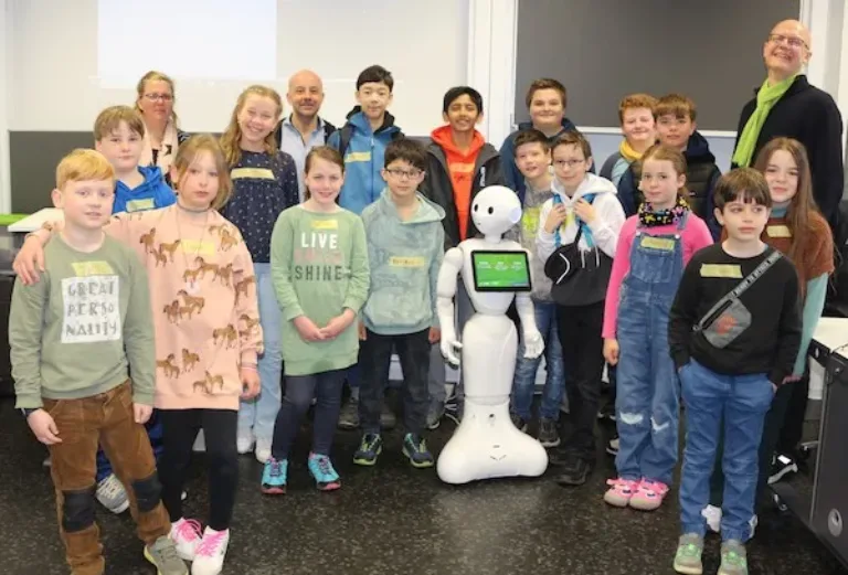 Technologien der Zukunft konnten 16 Kinder am StudiumPlus-Campus in Wetzlar im Rahmen des Osterferienprogramms der Stadt Wetzlar erleben. Im Smart Teaching Lab des dualen Studienprogramms lernten die Kinder z.B. den sprechen Roboter „Pepper“ kennen (Foto) und konnten ihm Fragen stellen. Mit der entsprechenden Brille erlebten die Kinder die so genannte Augmented Reality, bei der die reale Umgebung um virtuelle Elemente ergänzt wird, und sie tauchten mit der VR-Brille in komplett virtuelle Welten ab. Selbst Hand anlegen durften sie an den 3D-Drucker und die ausgedruckten Objekte als Andenken mit nach Hause nehmen. Den spannenden Vormittag gestaltete StudiumPlus gemeinsam mit der Stadtbibliothek Wetzlar.
