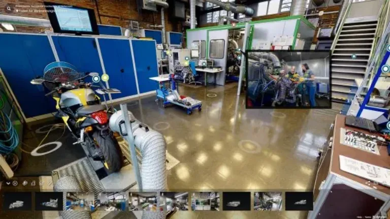 Nach dem Aufräumen und Putzen hat der eigentliche Scan nur etwa einen Arbeitstag gedauert. Beim virtuellen Rundgang gibt es nun viel zu entdecken und zu lernen: kleine Texte, Videos und Bilder erklären Gegenstände und laufende Arbeiten, etwa das Motorsport-Projekt des Fachbereichs M.