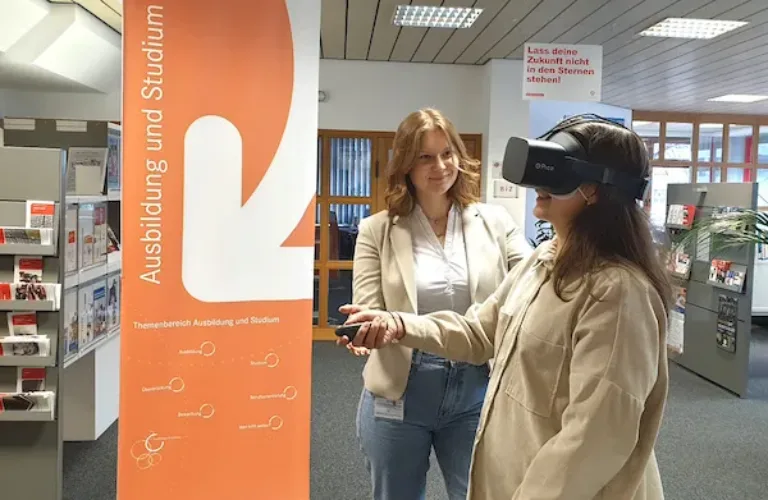 In den Berufsinformationszentren (BiZ) Limburg und Wetzlar können Besucher jetzt virtuell in 260 verschieden Ausbildungs- und duale Studienberufe eintauchen. Möglich macht dies ein neues Angebot der Berufsberater: Eine VR-Brille, mit der Auszubildende und Studierende an deren Ausbildungsplatz begleitet werden können: Mit Maurer-Azubi Tobi das Baugerüst erklimmen oder als Tower-Lotse den Flugbetrieb am Frankfurter Flughafen steuern. In den 3 bis 4-minütigen 360°-Videos lernen die Besucher Anforderungen, Ausbildungsinhalte, Tagesabläufe und Highlights der jeweiligen Ausbildung oder des dualen Studienganges kennen. Ein 3-D-Effekt vermittelt das Gefühl, direkt vor Ort dabei zu sein. Die Videos werden im 6-Monatsrhythmus aktualisiert. Interessierte Jugendliche und Erwachsene, die sich mit der VR-Brille beruflich orientieren wollen, können jeweils Termine in Limburg unter der Rufnummer 06431 209890 und in Wetzlar unter 06441 909155 vereinbaren.