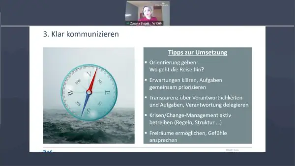 Danke an Frau Zuzana Blazek vom Institut der deutschen Wirtschaft für den Interessanten Vortrag „Hybride Führung“. Veranstaltet wurde der kurzweilige morgendliche Austausch vom Netzwerk Bildung des Regionalmanagement Mittelhessen. Mit dabei waren Mitglieder des Netzwerk Wirtschaft. Die Teilnehmer diskutierten über hybriden Führungsstil, Vorteile von klar definierten Kommunikationsstrukturen, Regeln der virtuellen Zusammenarbeit sowie den Begriff der Resilienz. Corona war der Treiber, aber diese Fragen müssen beantwortet werden, um die Wettbewerbsfähigkeit zu sichern.