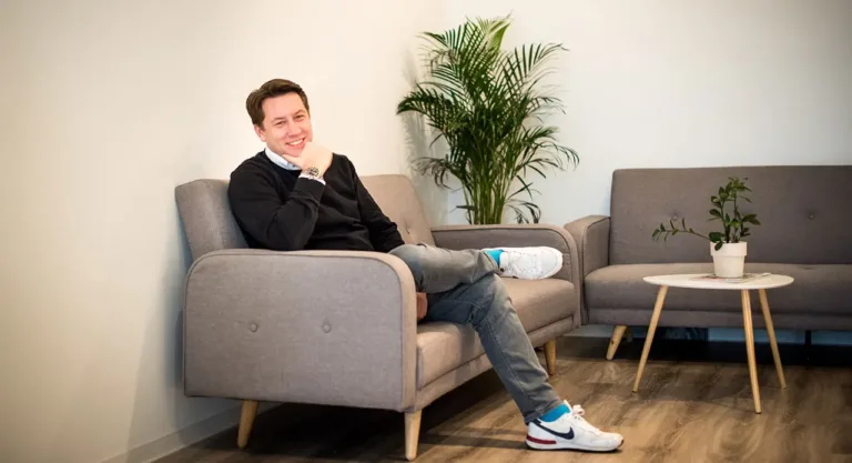 Schwarzer Pullover, graue Jeans und weiße Nike-Schuhe: Rudolf sitzt in einem Café unterhalb der FinTecSystems-Büros im Lindener Gewerbegebiet und nimmt