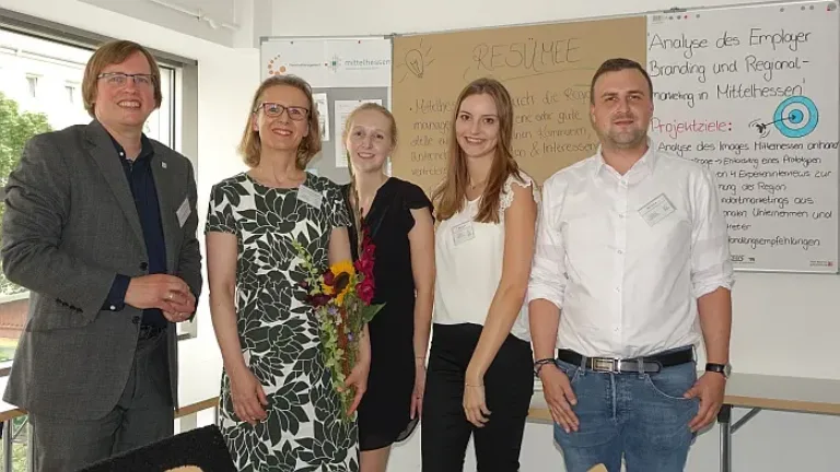 Bei der Projektpräsentation in Würzburg mit drei weiteren Projekt-Fallgebern fasste die Betreuerin, Prof. Dr. Christine Wegerich das Ergebnis so zusammen: „Wenn wir miteinander vernetzt arbeiten, uns austauschen und die gemeinsame Idee im Auge behalten, können wir gemeinsam erfolgreich sein“. Ihr ist das Projekt eine Herzensangelegenheit: „Gerne würde ich auf diesen Erkenntnissen aufbauen und diese mit Studierenden weiterentwickeln – entweder mit dem Regionalmanagement Mittelhessen oder auch mit einer anderen Region. Vielleicht könnten diese Regionen sich dann vernetzen und aus den jeweiligen Erfahrungen lernen. Das gemeinsame Projekt hat jedenfalls viel Freude gemacht. Vielen Dank für die tolle Unterstützung des gesamten Teams.“ Für die Studierenden war die Projektarbeit „Spaß und Stress“, wie Marie Lechner formuliert: „Praxis pur! Ich würde es aber auf jeden Fall wieder machen, auch weil die Zusammenarbeit mit dem Regionalmanagement so gut war“ Ann-Kathrin Wehrfritz ergänzt: „Ich habe auch für mich persönlich viel gelernt: dass die Betrachtung von der Metaebene her wichtig ist und dass zu einem Projekt auch Spontansein gehört: heute bei der Präsentation hat das ganz gut geklappt.“ Wehrfritz war für die erkrankte Sophia Rollmann eingesprungen. Die Studierenden haben mit der aus der IT kommenden agilen Methode „Scrum“ gearbeitet, Professor Wegerich erklärt, warum: „Mir ist es wichtig, dass die Studierenden diese doch noch relativ neue Methode kennenlernen, um Ideen aktueller Möglichkeiten der Projektarbeit kennenzulernen. Zum anderen haben wir bei uns im Schwerpunkt Personalmanagement immer schon agil gearbeitet, da wir wöchentlich den Projektstand reflektieren, analysieren und auch die persönliche Auseinandersetzung der Studierenden mit dem Lernprojekt begleiten. Scrum unterstützt diesen selbstreflektierenden Lernansatz.“