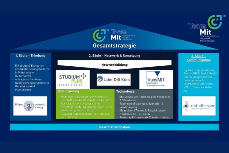 Die Automobilindustrie steht vor einem tiefgreifenden Wandel: Elektrifizierung, Digitalisierung, neue Mobilitätskonzepte und veränderte Marktstrukturen prägen die Zukunft der Branche. Auch in Mittelhessen sind die Auswirkungen deutlich spürbar. Mit TeamMit, dem Transformationsnetzwerk für die Automobilindustrie in Mittelhessen, wird dieser Wandel aktiv gestaltet. Das Projekt bringt Unternehmen, Institutionen und Akteure zusammen, um gemeinsam nachhaltige Strategien, Technologien und Qualifizierungslösungen zu entwickeln.