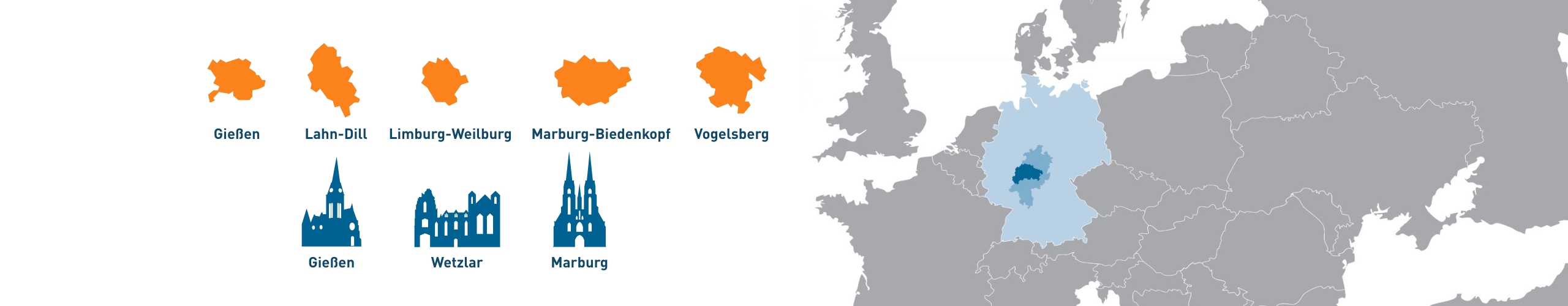 Mittelhessen mit den Landkreisen Limburg-Weilburg, Lahn-Dill, Gießen, Marburg-Biedenkopf und Vogelsberg und den Oberzentren Gießen, Marburg und Wetzlar ist geprägt durch