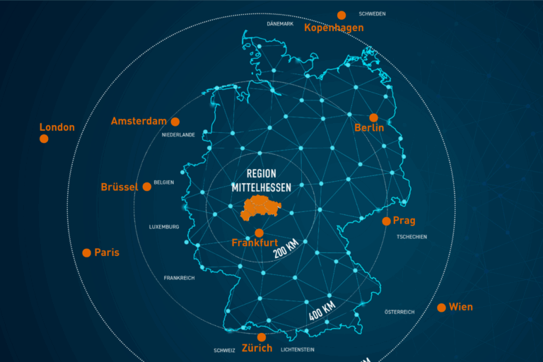 • Mitten in Europa: Das Rhein-Main-Gebiet mit dem internationalen Flughafen Frankfurt liegt praktisch vor der Tür. Metropolen wie Brüssel, Paris, Amsterdam oder Zürich sind in wenigen Stunden per Bahn oder Auto erreichbar. Diese zentrale Lage macht Mittelhessen zu einem idealen Ausgangspunkt für Handel, Forschung, Reisen und internationale Zusammenarbeit.