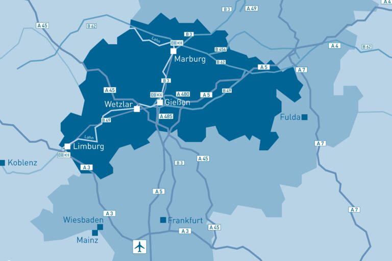 • Mitten in Deutschland: Im Süden grenzt Mittelhessen an das Rhein-Main-Gebiet mit Städten wie Frankfurt, Wiesbaden und Darmstadt. Im Norden befindet sich die documenta-Stadt Kassel, westlich das Rheinland, östlich schließt sich Fulda an. Von dort bildet sich eine Brücke nach Thüringen und Bayern. Durch diese zentrale Lage ist Mittelhessen geografisch, wirtschaftlich und verkehrstechnisch ein Knotenpunkt.